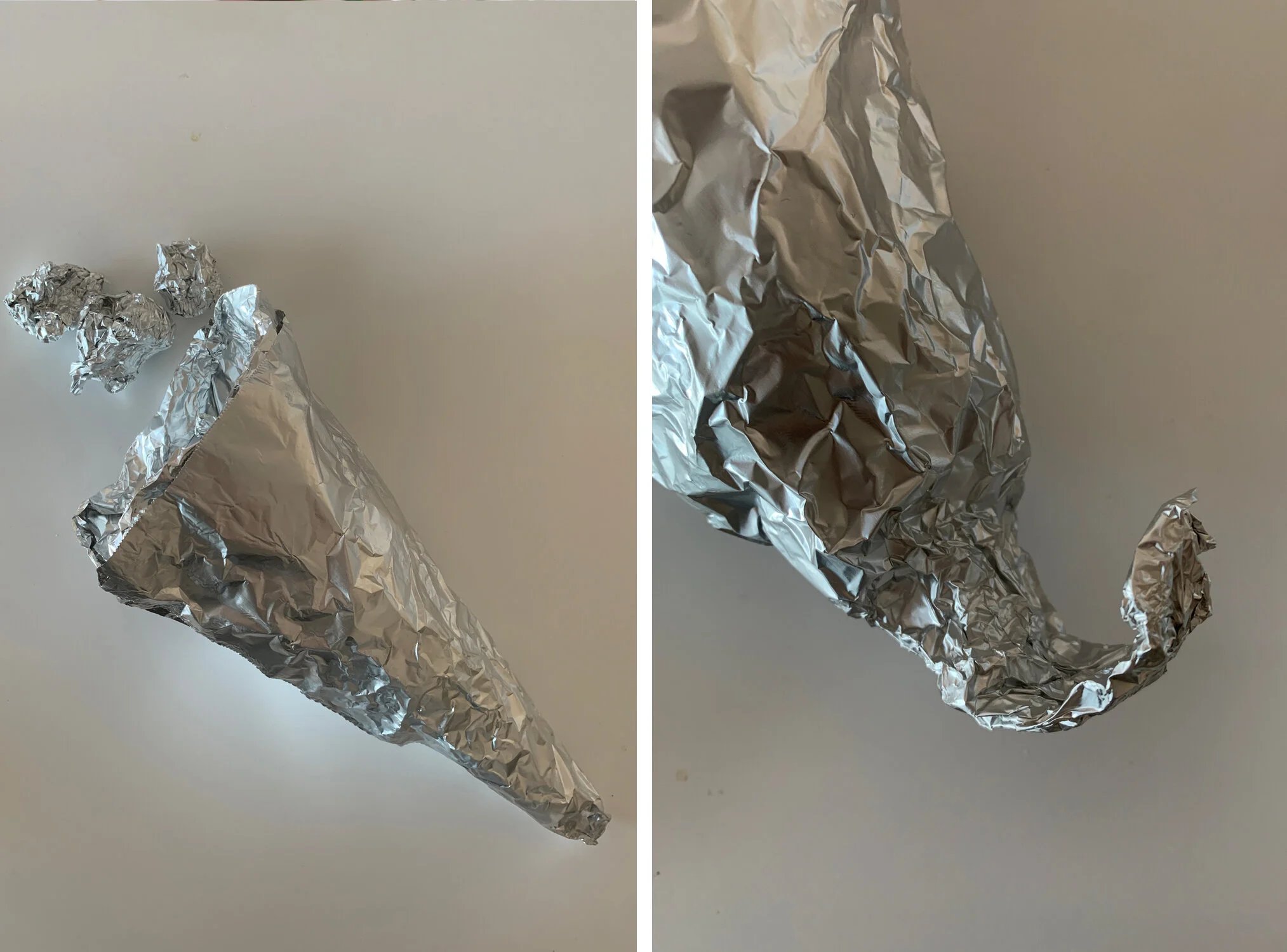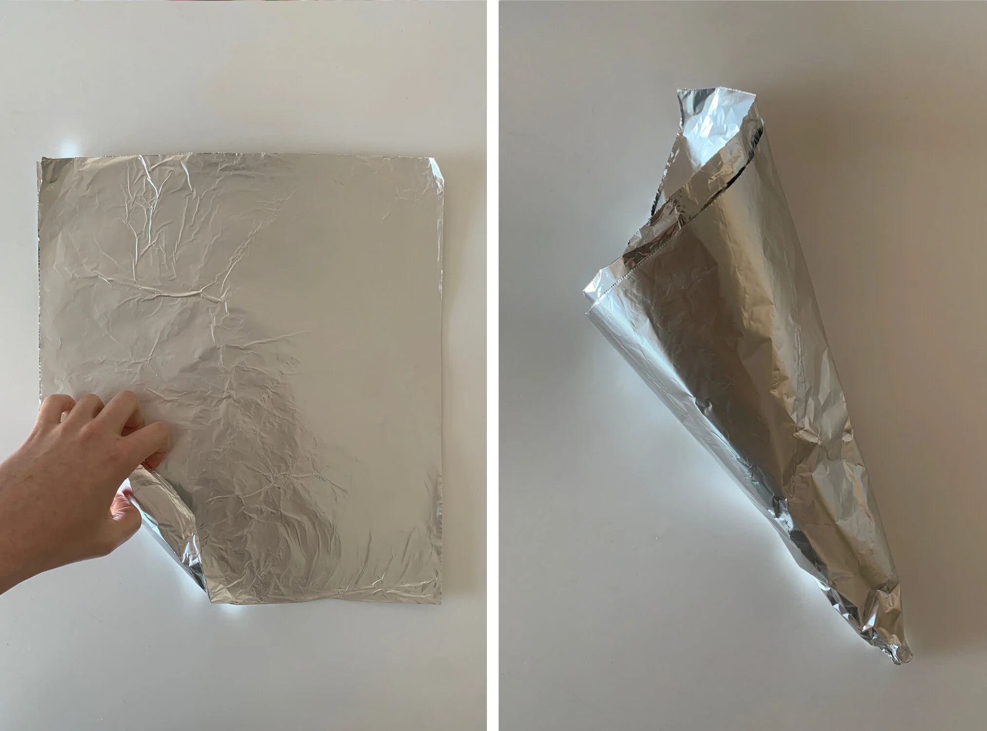 Make the cornucopia forms: Tear off a 24-by-12-inch piece of heavy-duty aluminum foil and fold it in half to create a 12-by-6-inch rectangle. Roll the foil diagonally into a hollow cone, keeping the opening wide—about 4 inches at its widest point. Crumple small pieces of foil and pack them inside the cone until it feels sturdy. Bend the narrow end slightly up and then down to create the classic cornucopia shape. Place the form on a parchment-lined baking sheet. Repeat to make a second foil cone and set aside.