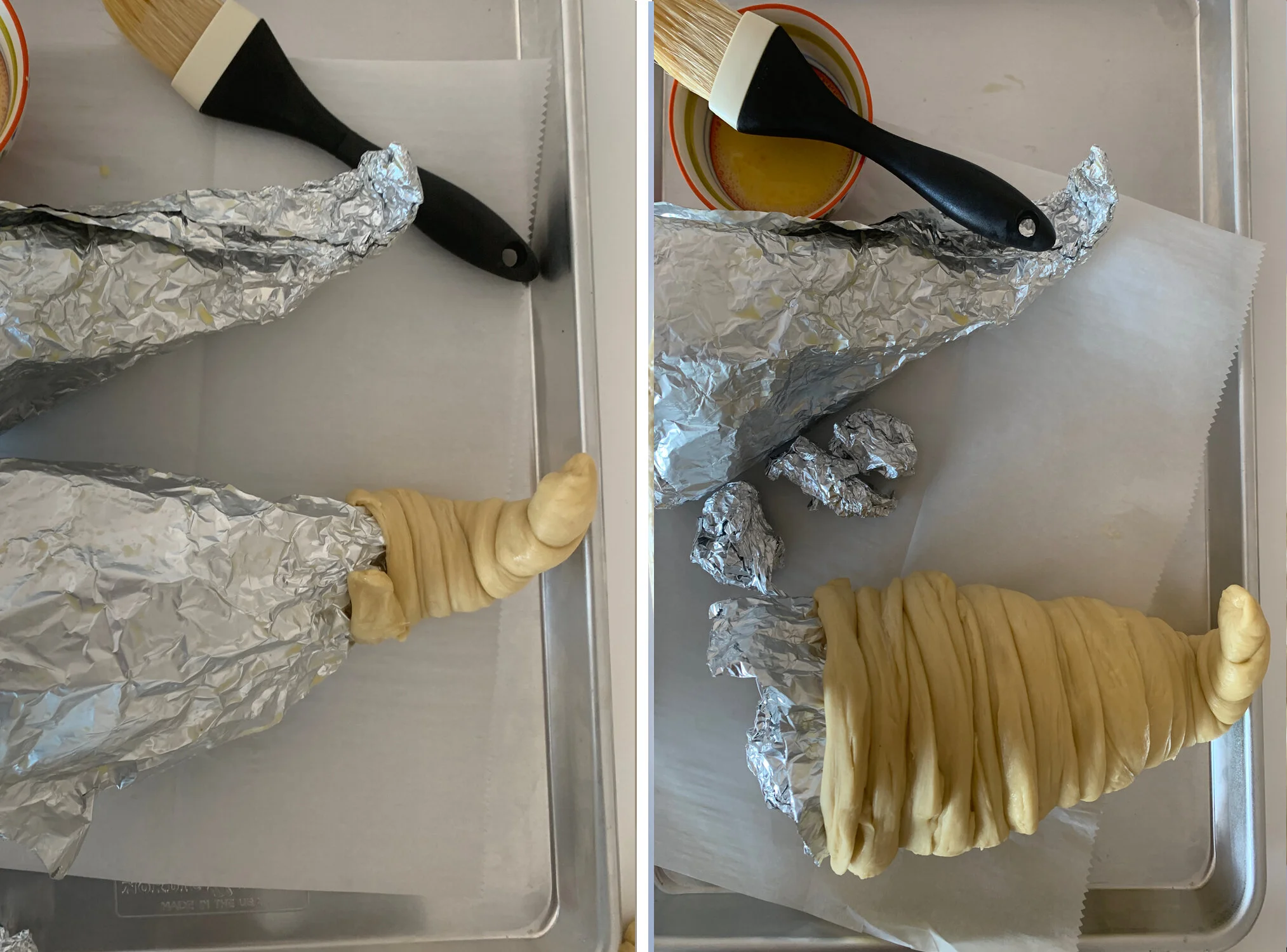 Shape the challah: Punch down the risen challah dough and divide it into pieces: nine larger, fist-sized balls and six smaller, half–fist-sized balls. Roll each of the larger pieces into long ropes. Starting at the tip of one foil cone, wrap a rope of dough around the form, pinching gently to secure. Brush the end of the rope with egg wash and attach the next rope, continuing to wrap until the cone is covered. Slightly overlap the strands to avoid gaps, and tuck the seams underneath whenever possible. Repeat with the second cone.