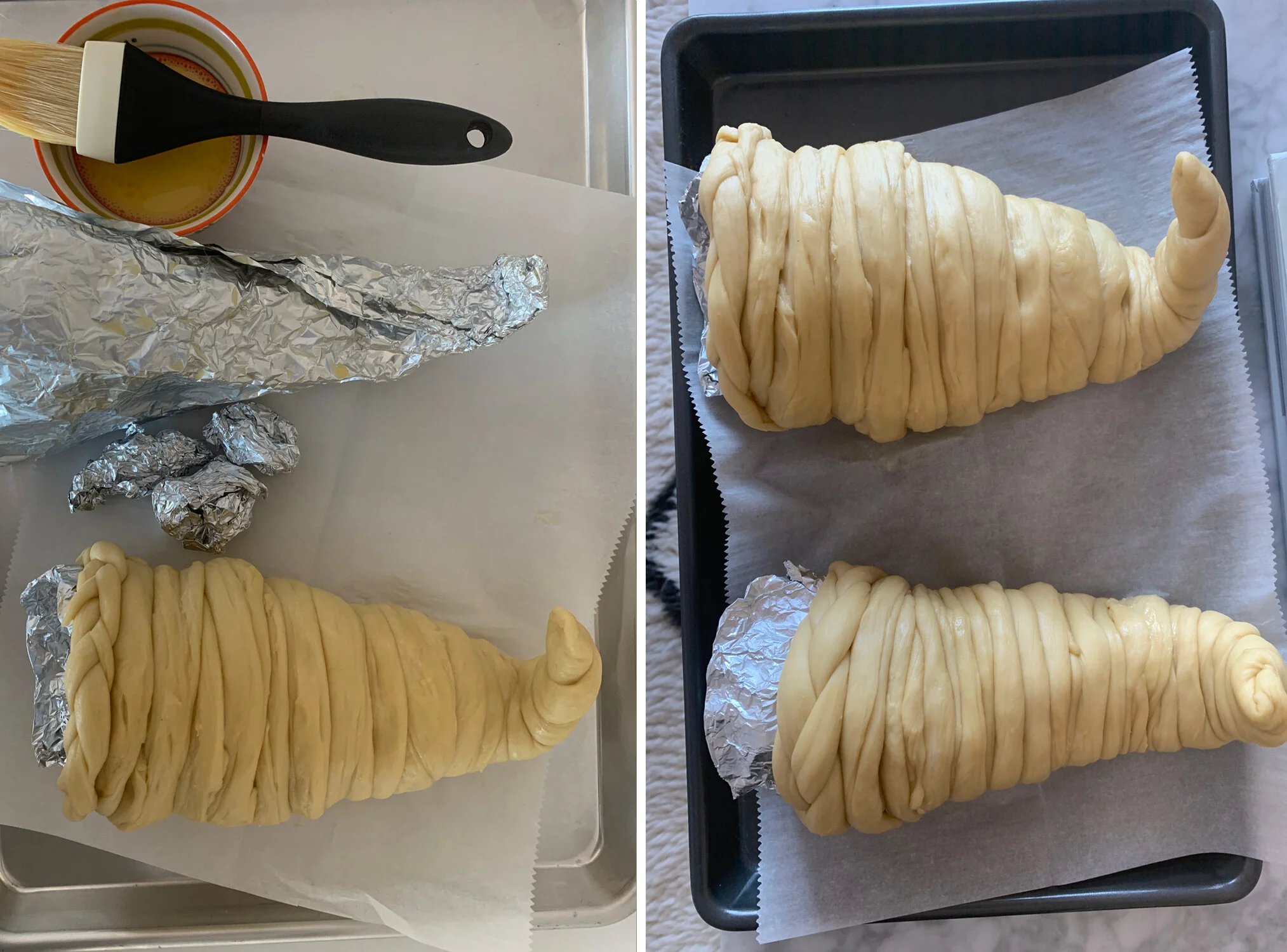 Roll the smaller dough pieces into three ropes and braid them together. Brush the open edge of each cornucopia with egg wash, then gently press the small braid onto the opening to finish the loaf. Tuck the ends underneath and pinch to secure. Cover both loaves loosely and let rise for 30 minutes.