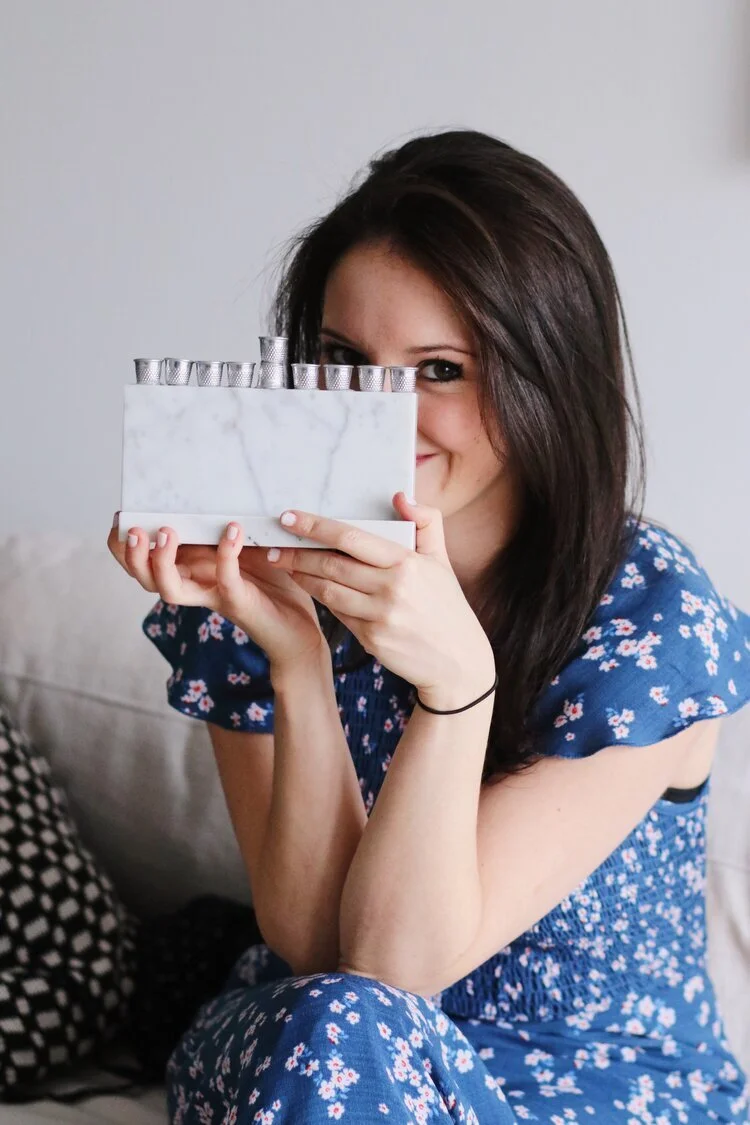 Prep the thimbles: Light a spare candle and drip a thin layer of melted wax into the bottom of each thimble. Once filled, arrange all ten thimbles across the top of the marble base to plan spacing—eight in a row, with two stacked in the center, as shown, for the shamash.