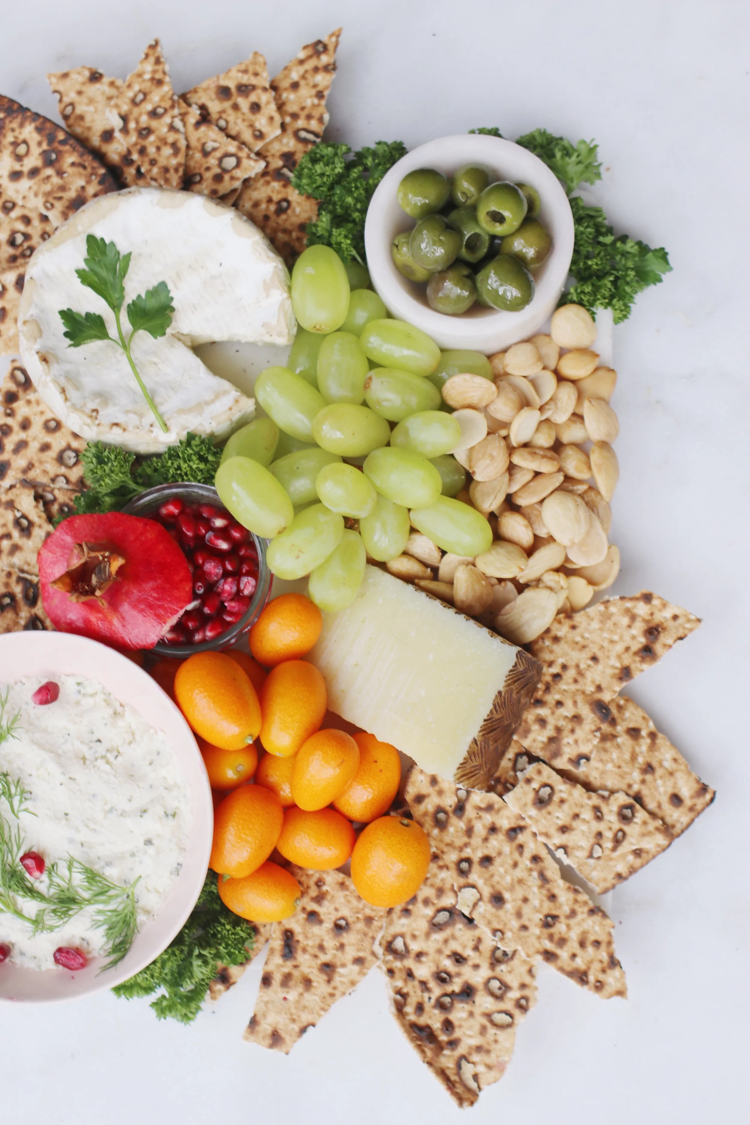 This isn’t so much a recipe/tutorial as it is a suggestion. Think of it as inspiration for what to put on the table when you want a Passover lunch or snacky moment to feel festive without turning it into a project. The idea is simple: swap crackers for matzah and build from there. I like using shmura matzah; it’s large and irregular, which I think makes the board so beautiful. But whatever matzah you have will work! Add a few cheeses with different shapes and textures, then fill in the spaces with something fresh and green. Parsley is a nice nod to karpas, pomegranate seeds add a pop of color, and after that, you’re free to follow your instincts. The only real goal is abundance—pile it all on, let things overlap, and don’t worry if it looks a little messy. Cheese boards are at their best when they feel generous.