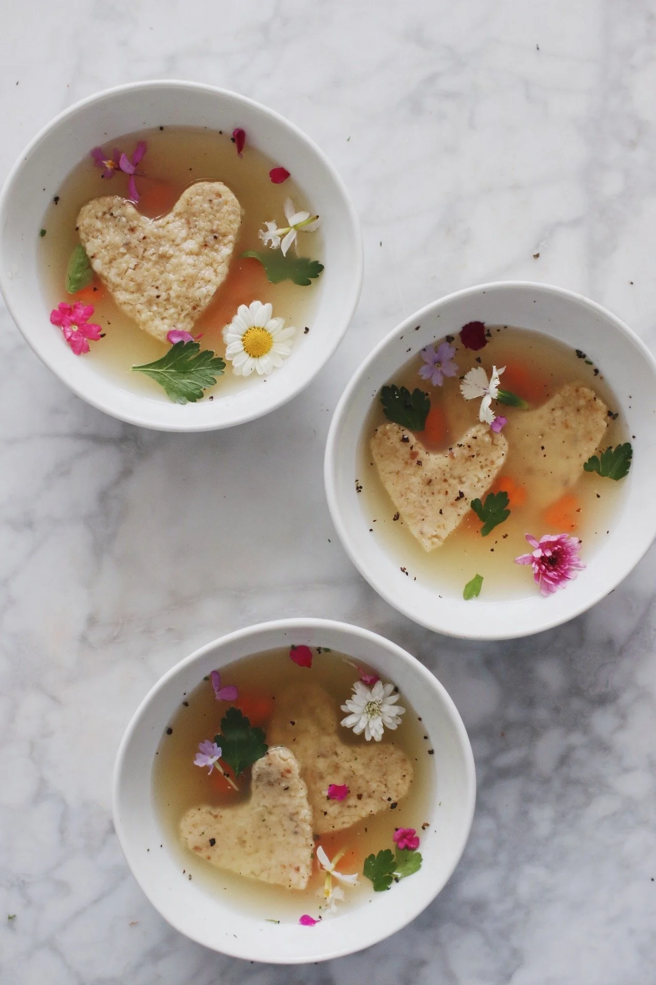 To make them, begin with your favorite matzah ball soup recipe; once the “batter” is chilled as called for in the recipe, place it on a parchment-lined baking sheet, flatten it gently with your hands, and then stamp out shapes using simple cutters—letters, hearts, flowers, etc. Avoid cutters with lots of sharp edges, which tend to fall apart; clean, rounded shapes hold up best (a heart works beautifully, for instance; anything too jagged, like a star, might not hold up).Freeze the stamped shapes again, for at least 30 minutes, on a parchment-lined sheet before cooking to help them hold their form. Then resume the soup recipe, using a slotted spoon or spider to gently lower the shapes into the pot.